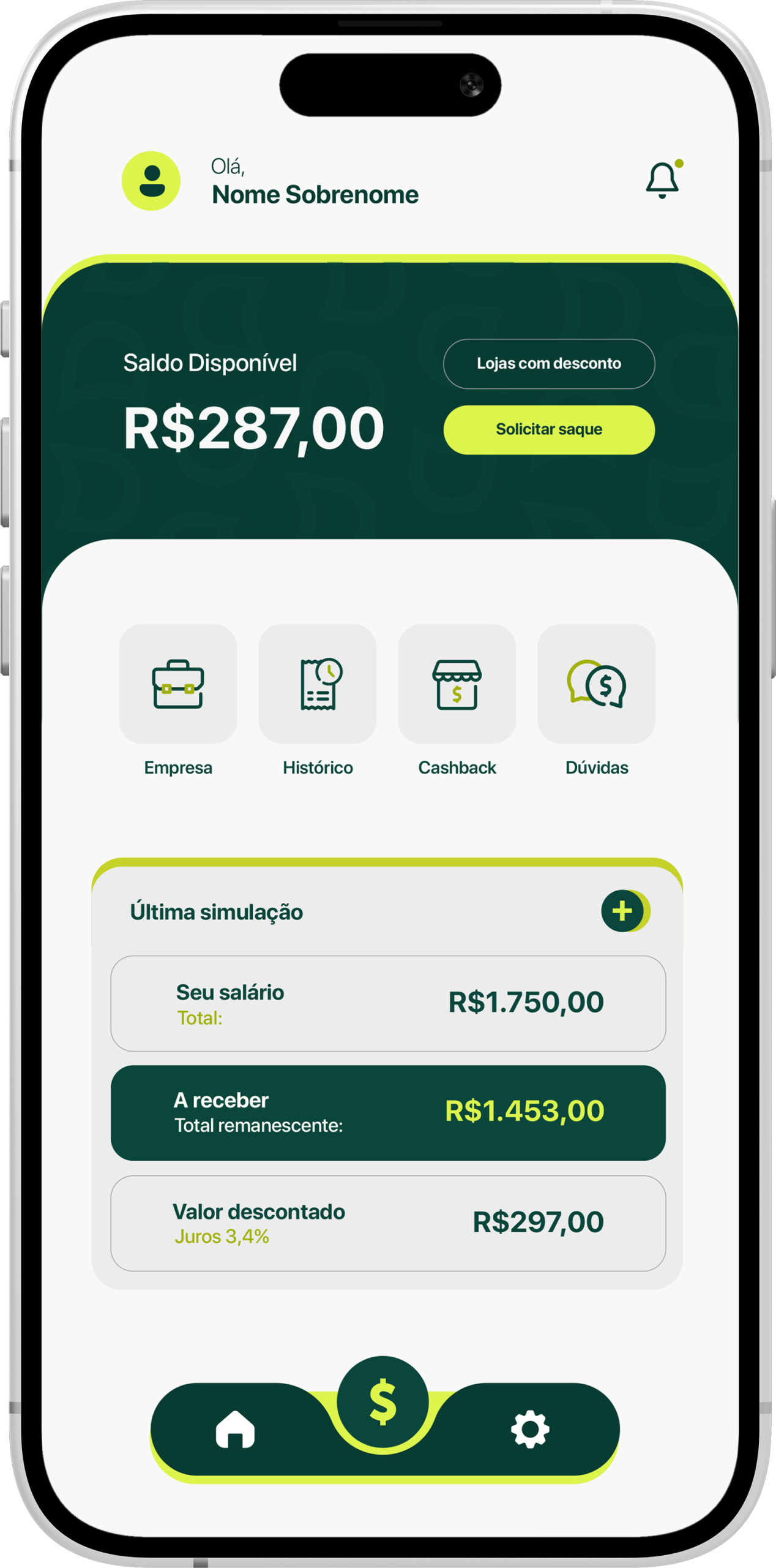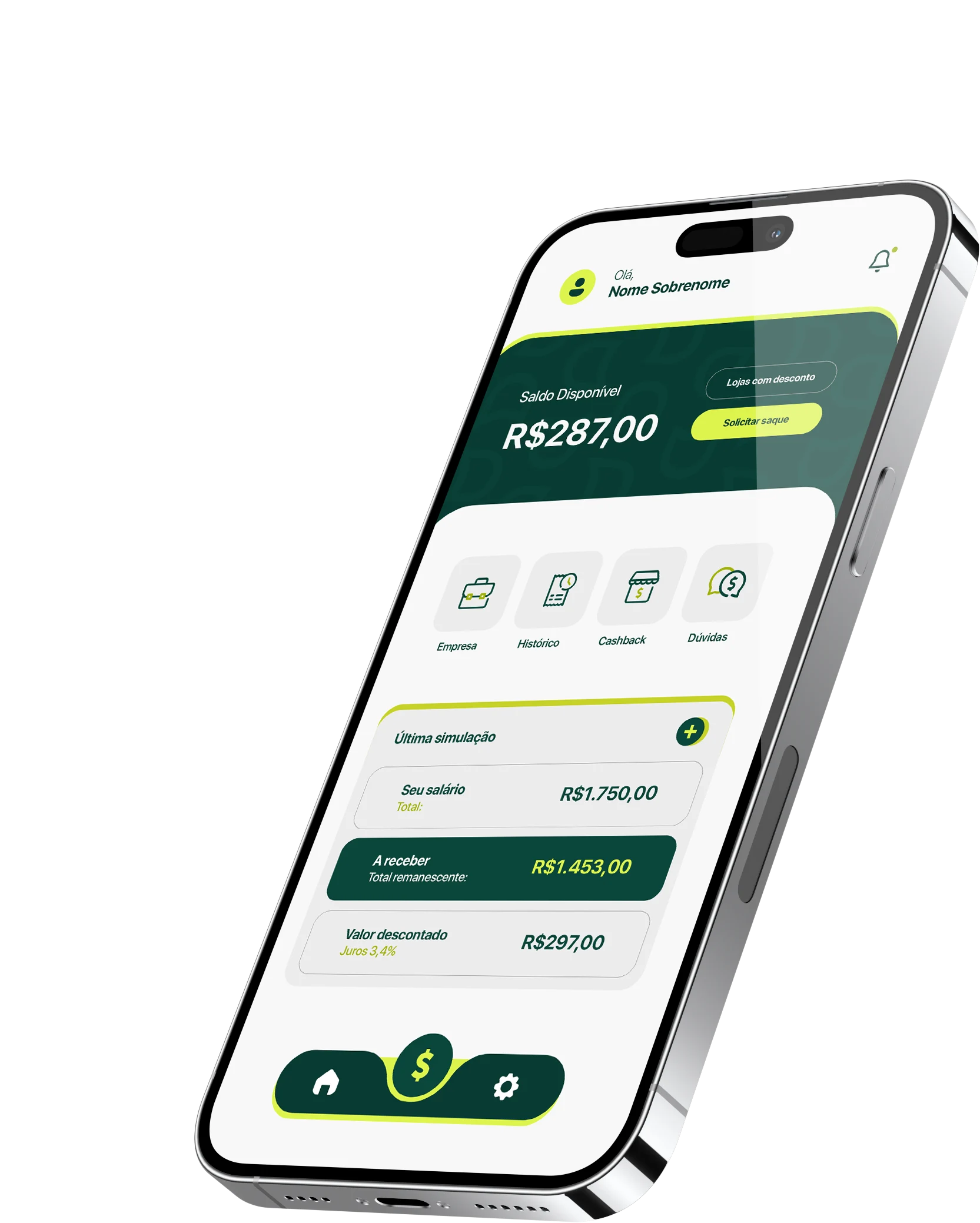 Pelo nosso aplicativo, você solicita uma pequena antecipação que será descontada automaticamente do seu salário (para trabalhadores CLT e assalariados) ou do seu benefício (no caso de aposentados e pensionistas).